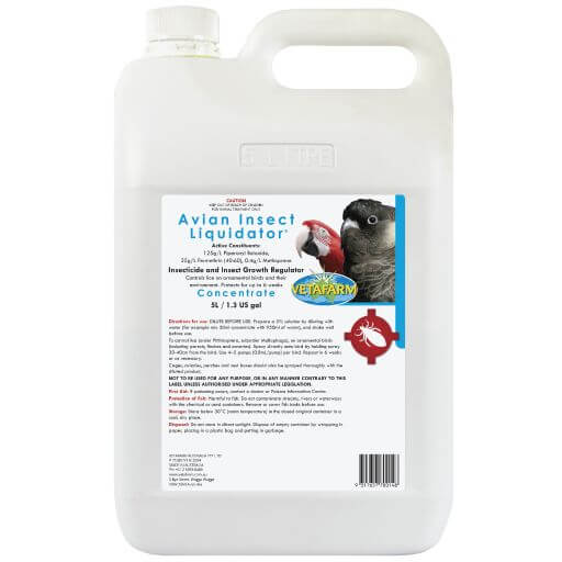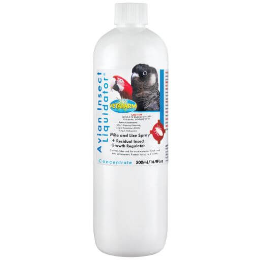 Avian Insect Liquidator was formulated by avian veterinarians to control avian lice (order Phthiraptera, suborder Mallophaga) in ornamental caged birds and their environment. Provides instant knockdown of mites and lice and 6 weeks residual protection of both birds and their environment.