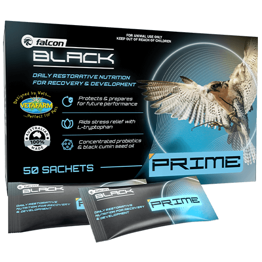 Moulting and recovery periods can cause stress, anxiety and loss of condition in performance Falcons. Falcon Black Prime is a unique blend of nutraceuticals designed to reduce stress and anxiety, while priming and maintaining a falcon’s physical conditon when not hunting or racing. Falcon Black Prime also contains high concentration probiotics, echinacea and black cumin seed oil to support the immune system and increase natural resitance to  disease, maintaining peak health and condition.