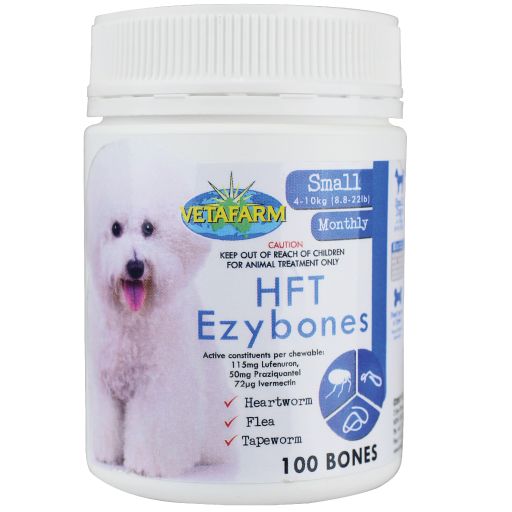 Fleas, Heartworm and Tapeworm are all nasty parasites that effect your dog’s health. HFT provides protection from all three of these pests in one easy, monthly treat.