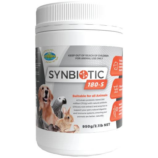 The gut is full of microorganisms such as bacteria, fungi, viruses and protozoa. The collective of all these microorganisms is referred to as the microbiome. The health of the microbiome in our pet’s gut is absolutely essential for a healthy life. The good bacteria (probiotics) in the microbiome help digest food, regulate the immune system and protect against other bacteria that cause disease (pathogens).Synbiotic 180-S was formulated by veterinarians for use in all animals in times of stress, illness, injury, post antibiotic treatment or as a daily supplement to support the immune and digestive systems.